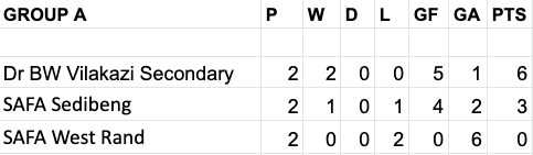 SAFA West Rand did not feature on Sunday, meaning Group A was a straight shoot-out between SAFA Sedibeng and Dr BW Vilakazi Secondary, which the latter won 2-1.